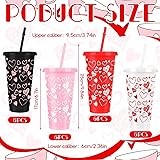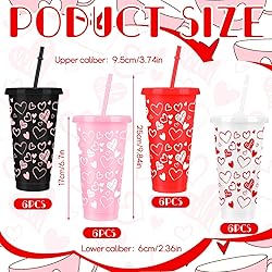 Product Include and Size:As a Valentine's Day gift set, you will receive 24 plastic cups with straws. The capacity of each cup is about 27 ounces, which is the right size to meet your drinking needs. Excellent Quality:This Valentine's Day gift cup is made of high-quality plastic and is paired with a very convenient straw. It can be used for a long time without being easily damaged and can meet your drinking needs. Valentine's Day Gifts:This Valentine's Day plastic cup set is very suitable as a Valentine's Day gift. The unique heart-shaped design is matched with the practicality of the plastic water cup. It is very meaningful as a gift, thoughtful and practical. Unique Design:This Valentine's Day cup set comes in four styles: a white cup with a red heart, a pink cup with a white heart, a red cup with a white heart, and a black cup with a pink heart. The various designs can meet your different aesthetic needs. Good Memories:These beautiful gifts are perfect for creating everlasting memories with friends and family; the joy of being with good friends and the beauty of the party atmosphere combine to create a magical moment that will be cherished forever.
