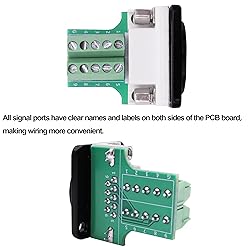 - "CybNemo D-Type DB9 Solderless Terminal Connector Panel Mount Adapter DB9 Female RS232 Serial to Screw Terminal Breakout Board D-SUB 9 Pin PCB Board -Black Suitable for computer, cash register, tax control machine, set-top box, barcode machine, PLC, PDA, MODEM, automatic control equipment, industrial control equipment, etc. DB9 solderless terminal adapter is convenient for project and on-site equipment debugging, and can be used for testing purposes to check pins, cables, or any device with RS232 interface. The design of the solder free terminal block is easy to install, does not require welding, and is convenient for quick wiring. The DB9 D-SUB breakout board serial adapter has pure copper gold-plated contacts, which provide good contact, improve conductivity, and reduce signal loss. The PCB board has fine solder joints, stable signals, and anti-interference. All signal ports have clear names and labels on both sides of the PCB board, making wiring more convenient. Connector: DB9 9-pin terminal block. Connector contacts: gold-plated contacts. Material: Copper based plastic. Process: PCB board soldering. Package included: 1 * DB9 Female Solderless Terminal Breakout Board Adapter. 1 * Screwdriver. 2 * Screws. "