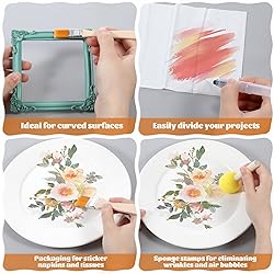 Complete 20-Piece Decoupage Set: This comprehensive kit includes 1 silicone mat, 5 foam brushes, 8 decoupage brushes, 3 water pens, 2 glue bowls, and 1 spray bottle. All tools are reusable and designed to cover every aspect of decoupage projects, making it perfect for beginners and experienced crafters alike. Professional Smoothing Tools: Achieve flawless results with ergonomic foam brushes that smoothly apply decoupage napkins without wrinkles or bubbles. Multiple sizes allow you to cover large surfaces and reach tricky corners while protecting delicate materials. The soft foam ensures even pressure distribution for perfect adhesion every time. Precision Application Brushes: 8 brushes in four different sizes provide ideal coverage for both large areas and fine details. Designed for professional-level adhesion on various surfaces including wood, canvas, terracotta, and plastic. The tapered bristles allow controlled glue application without messy drips or uneven coverage. Smart Workspace Protection: The non-slip silicone mat protects your work surface from glue and scratches, while the specially designed glue bowls feature drip-free pouring spouts. Combined with the adjustable spray bottle that ensures uniform moisture control, these tools maintain a clean, organized workspace throughout your creative process. Versatile Multi-Purpose Use: Perfect for various crafts including furniture renovation, greeting card making, photo frame decoration, and fabric transformation. The water pens enable precise shape tracing while the complete tool selection simplifies applying paper napkins or tissue to any surface. An ideal gift for craft lovers seeking professional results.