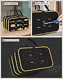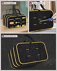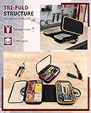 HEAVY DUTY FABRIC: Made of heavy duty polyester that is water resistant and tear resistant. TRI-FOLD DESIGN: The bag is composed of 3 zippered cases that can lay flat when opened or fold into a compact carry bag. One case can be detached via zipper and used independently. CLEAR VIEW & MOLLE WEBBING: The clear panel for quickly seeing what’s inside without opening. The front 2 rows of molle straps to attach extra accessories. SPACIOUS & ORGANIZED: Overall size: 11.25” x 6.25” x 6.5” | Small pouch size: 11.25” x 6.25” x 2”. Easy to separate and organize tools such as pliers, wrench sets and screw driving bits. EASY TO CARRY: Top handles make it convenient to carry on the go.