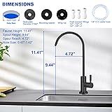 - 1.Drinking Water Faucet Included Components: RO Water Faucet (Matte Black) Quick Connect Fittings (2 different sizes: 1/4" to 1/4" and 1/4" to 3/8") 1/4" O.D. Water Hose for connection or replacement Mounting Hardware including washer wing nut for installation A clear instruction manual. 2.Compatibility with the filtration system? Compatible with most RO systems,Comes with 2 push-connect fitting sizes (1/4"-1/4" and 1/4"-3/8") to fit different filtration system water outlet sizes. 3.Material & Finish Stainless steel: Durable, corrosion-resistant, modern look Finished:Matte Black Lead-free certification: Essential for drinking water safety. 4.Spout Design Faucet features 360-degree swivel capability. The gooseneck spout rotates completely around, allowing you to direct water flow to any angle you need for filling containers or cleaning around your sink. 5.What tools do I need? Tool-free installation with included quick-connect fittings and clear instructions,only takes 5-10 minutes to complete.