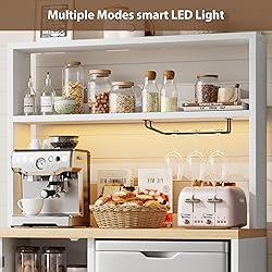 Jocoevol Mini Fridge Stand with Storage, Microwave Stand with Power Outlets and Glass Holder, Kitchen Rack, Farmhouse Design Bakers Rack with Storage for Living Room, Entryway, White