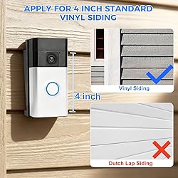 Special Note: 4" Standard Vinyl Only, Not For Dutch Lap Siding. Make sure your siding is 4-inch standard vinyl siding before buying. (Doorbell is NOT included) Compatibility: This ring vinyl siding mount is compatible with Ring Battery Doorbell 2nd Gen(2020/2024 Release), Ring Battery Doorbell 1/2/3/4/Plus/Pro, Ring Battery Doorbell Plus(2023 Release), Ring Battery Doorbell Pro(2024 Release). Not compatible with Ring Wired Doorbell Plus/Pro(2021/2025 Release) and Ring Video Wired Doorbell(2021 Release). Please check your doorbell model before purchasing. Adjust Viewing Angle: This mounting bracket can easy installation solves the angle problem of the video doorbell very well. The flush design allows the doorbell camera to sit flush against vinyl or other slanted siding, creating a clean, professional look. When installed, the doorbell will face straight ahead instead of slanting upwards. Doorbell Mount for Outdoor Vinyl: Simply use the ultra-long screws included with the doorbell bracket to secure it to the 4-inch vinyl wall panel. The doorbell bracket fits snugly against the wall panel and is not easy to fall off. Premium Materials: Doorbell holder is made of high qualit ABS material, it won't rust and prolong the time of use. Closely integrated with the doorbell, sturdy and reliable.