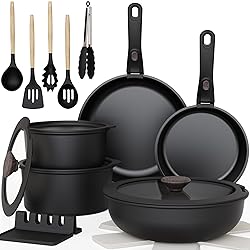 - Versatile Nonstick Cookware for Healthy Cooking Anywhere Upgrade your cooking experience with the Astercook 20-Piece Nonstick Ceramic Pots and Pans Set. Designed for versatility and convenience, this cookware set features a nonstick ceramic coating that ensures healthy, low-fat cooking with effortless food release and easy cleanup. The removable handles allow for seamless transitions from stovetop to oven, perfect for compact kitchens, RVs, and small spaces. Space-Saving, Durable, and Multi-Stovetop Compatible Thanks to its stackable design, the entire set stores neatly to maximize space, while compatibility with induction, gas, ceramic, and electric stovetops ensures even heat distribution for reliable cooking results. Built from high-quality aluminum and oven-safe up to 400°F, this cookware is made to last through years of culinary adventures. With Astercook's commitment to quality and customer service, you can cook confidently, knowing that each meal will be a success. Brand: Astercook Specification: 20 PCS Pots and Pans Set Material: Aluminum, Granite Handle Material: Bakelite with Silicone Coating: Granite Health Coating Color: Black Item dimensions: 13.1"D x 12.7"W x 7.3"H Item Weight: 10.7 Pounds