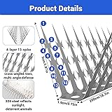 Unique Design: Squirrel proof baffle feature a distinctive reverse barb design, with each 5 cm long spike bearing 13 barbs pointing in opposite directions. This structure effectively prevents animal contact and hinders climbing attempts. This delivers 360° full coverage for significantly improved protect Wide Application: Pigeon spikes can be bent arbitrarily, effectively preventing pigeons, squirrels, raccoons, cat, birds etc. from invading your private area, tightly winding 4-5 circles will have better effect when defending against large animals. We mainly use it for deterrent on animals, please love animals Easy installation: The squirrel deterrent spikes can be adjusted according to the specific use situation. You can choose to fix it to the fence garden tree with screws, cable ties or glue. It is recommended to wear gloves to reduce contact with thorns, always prioritize safety. Never pull it open with bare hands to avoid injury Stainless Steel Material: Bird spikes are made of high-quality 304 stainless steel, which is rustproof, corrosion-resistant, and weather-resistant performance,providing long-lasting protection for outside, fences, trees, garden,roofs, wall and drainpipes. The surface of stainless steel reflects sunlight and can be a good deterrent to animals Package List: Raccoon deterrent spikes 80 inch, complete with steel wire, plastic cable ties, screws, metal ties, and protective gloves. Our squirrel baffle spikes for bird feeder can be easily cut or bent to suit various surfaces. Use tools like wire pliers to customize the bird spikes to fit spaces Caution: Before handling bird spikes, always wear heavy-duty work gloves to protect against puncture wounds from the sharp barbs.STEP 1: Have ready: A pair of pliers to assist with unrolling.STEP 2: How to unroll spikes: The bird spikes come tightly coiled. If the barbs are tangled and difficult to pull apart, use the pliers to grip one end. Gently wiggle it side to side while pulling to carefully straighten and separate the coil