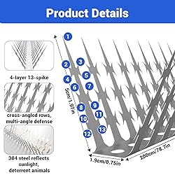 - 360° Full Protection Advanced Animal Deterrent Spikes Tired of squirrels raiding your bird feeders, pigeons roosting on ledges, or raccoons invading your garden? Our professional-grade stainless steel animal deterrent spikes provide a robust, long-lasting, and humane solution. Engineered with precision and durability in mind, this bird spikes is designed to create an barrier, ensuring your private areas remain undisturbed by unwanted wildlife. Its innovative design goes beyond simple spikes, offering multi-directional defense for peace of mind season after season. Barrier Technology: The Reverse Barb Advantage The core of our product’s effectiveness lies in its patented reverse barb design. Each 5cm stainless steel spike features 13 precision-cut barbs pointing in alternating directions. This creates a complex, multi-angled defense grid that is far superior to traditional straight spikes. Animals cannot find a stable foothold or grip from any angle, effectively blocking climbing, perching, and crossing attempts. Whether installed horizontally or vertically, it delivers true 360° full-coverage protection, leaving no weak points for persistent critters to exploit. Superior Versatility for Whole-Property Defense This is not just a pigeon spike—it’s a comprehensive bird deterrent spikes for a wide range of nuisance animals. Easily bend and shape the strip to fit curved or irregular surfaces like pipes, garden trellises, tree trunks, and arched fence tops. A single continuous strip can safeguard multiple areas: For Birds & Squirrels: Install on roof peaks, eaves, window sills, and bird feeders. For Climbing Pests like Raccoons & Cats: Wrap tightly (4-5 circles recommended) around downspouts, support beams, and tree trunks to create a protective belt that stops upward movement. For Perimeter Security: Mount along fence lines, gate tops, and garden walls to prevent animals from using them as highways. Engineered for Lifetime Durability with 304 Stainless Steel Constructed entirely from premium grade-304 stainless steel, our deterrent spikes are built to withstand harsh outdoor conditions. They are completely rustproof, corrosion-resistant, and will not degrade under rain, snow, or temperature extremes. Unlike plastic or coated alternatives that become brittle and fade, our stainless steel maintains its structural integrity and sharp effectiveness for years. The naturally reflective surface also adds a visual deterrent element, subtly enhancing its protective effect. Smart, Safe & Customizable Installation We provide a complete kit for immediate use and emphasize safe handling. The strip can be quickly secured using the included heavy-duty screws, metal ties, and cable ties for a permanent hold, or easily adjusted as needed. Custom-Fit Anywhere: Use standard wire cutters to trim the strip to your exact required length. Bend it by hand (with gloves) to conform to unique shapes. Safety First Protocol: Always wear the included protective gloves. If the coiled strip is tightly wound, use pliers to gently grip an end and wiggle while pulling to unravel safely—never use bare hands. No Damage Installation: Offers multiple mounting options to suit different surfaces without causing significant damage when installed correctly. Complete Kit, Ready to Deploy You receive a full 80-inch deterrent spikes, reinforced steel wire for added stability, a selection of durable plastic cable ties, screws, metal fastening ties, and a pair of puncture-resistant protective gloves. Everything you need for a successful installation is in the box.