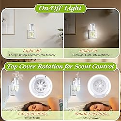 Upgraded Timer and Nightlight Function: The fragrance plug serves both as perfume diffuser and night light. On this basis, it has added a timing function, supporting multiple timing settings of 2/4/6/8 hours, allowing you to easily manage the usage time, making it both worry-free and convenient Fragrance Plug Compatible with Bath & Body Works Wallflowers: This plug is fully compatible with Bath and Body Works Wallflowers refills. Just rotate and fix the fragrance filler (not included) into our plug, and you can enjoy the scent. It is simple and convenient to use. Note: Diffuser only, refills are sold separately Rotatable Plug Design: The fragrance diffuser features a rotatable plug, suitable for both vertical and horizontal outlets. The specially designed rotating top cover can easily adjust the fragrance dispersion, preventing leakage and ensuring the rapid and balanced release of the fragrance without taking up your space Effortless Plug and Play & ETL Certified Safety: This plug in fragrance diffuser operates at just 3W (120V / 60Hz) for energy-efficient, long lasting scent diffusion. ETL certified to meet strict safety standards, it ensures reliable performance and peace of mind—simply plug it in and enjoy a soothing fragrance throughout your space Wide Applicability: This wall fragrance plug can be safely operated in any room, such as your bathroom, kitchen, living room, bedroom, office, washroom or any place you want to stay. It can easily remove odors, freshen the air and provide you and your family with a fragrant environment