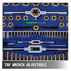- Multifunctional Tool It is extensively used in many fields like machine tools, precision modules, transformers, etc. Specifications Material: Tungsten steel Type: Tap & Die Tap And Die set Titanium Number of Pieces 86pcs Length: 50.8 cm/20'' Width: 27.94 cm/11'' Height: 7.62 cm/3'' Net Weight: 5.9928 kg/13.2 lbs Volumetric Weight: 1.57717 kg/3.473942lbs Package Length: 50 cm/19.69'' Package Width: 27 cm/10.63'' Package Height: 7 cm/2.76'' Gross Weight: 6 kg/13.22 lbs Package Content 1 x Adjustable Tap Wrench (M6 to M20 - 1/4" to 3/4") 1 x Long Handle Adjustable Tap Wrench (M3 to M12 - 1/16" to 1/2") 1 x T-Handle Tap Wrench 1 x Die Handle (M25 - 1") 1 x Long Die Handle (M38 - 1-1/2") 1 x Screwdriver 1 x Screw Pitch Gauge Metric 1 x Screw Pitch Gauge SAE