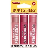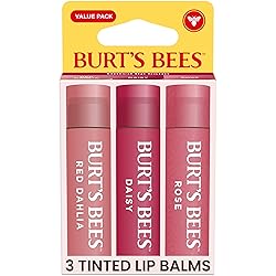 Burt’s Bees Tinted Lip Balm Value Pack Includes 3 Lip Balms: Red Dahlia, Daisy and Rose; 8 Hour Moisture; Provides a Hint of Color; Nourishing Shea Butter; 100% Natural Origin; 3 Tubes; 3x0.15 Oz.