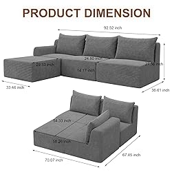 L-Shaped Sectional Couch: This L-shaped sofa features movable modules and reversible chaise that can be freely combined. Switch your layout in seconds! Its simple design and soft fabric maximize space while adding a stylish, modern touch to your home. Boneless Modular Sofa: This ultra-soft cloud couch features a unique boneless design with integrated armrests, blending both comfort and practicality. Unlike traditional spring-loaded sofas, it offers superior softness and exceptional rebound performance. With no springs to puncture, it ensures a safer and more comfortable seating experience, making it the perfect choice for long-lasting relaxation. Soft Corduroy Fabric: The sofa is upholstered in luxurious corduroy fabric, blending softness, comfort, and durability. Its stain-resistant and removable cover ensures effortless cleaning, making it ideal for everyday use. The plush texture adds a cozy, warm feel, enhancing your relaxation time. No Assembly Required: The modular couch arrives in one box—just unpack, give it a moment to settle, and it's ready for you to enjoy. Say goodbye to the hassle of assembly, and hello to a more convenient and seamless experience. For optimal comfort and flexibility, allow 48-72 hours for the sofa to fully expand. It’s the perfect addition to elevate your home with ease and style. Versatile for Any Space: This convertible sofa set is perfect for living rooms, bedrooms, offices, apartments, and more. Its flexible configurations cater to various needs, enhancing your space with both comfort and style. Whether you're relaxing, entertaining, or working, it creates a cozy and inviting atmosphere in any room.