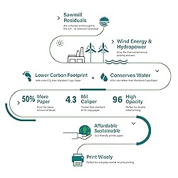 Elementree printer paper is made in the USA using leftover sawmill wood chips - no new trees are harvested. Its pulping yields 50% more paper from the same amount of wood than standard copy paper This acid-free, FSC certified computer paper ensures lasting results while also supporting green forestry practices. The hydropower paper-making process uses 47% less water than standard copy paper 5-ream printer paper case; 2500 sheets (500 per ream); 20 lb/75 gsm copy paper 8.5" x 11"; features a natural shade similar to a paperback book that is easier on the eyes This copy & multipurpose paper is compatible with inkjet and laser printers and copiers for jam-free, high-volume production, making it versatile for everyday home, school, and office use Ideal for double-sided printing, this high-opacity printer paper minimizes show-through to reduce paper consumption. Print Wisely with Elementree's eco-friendly printing paper solution