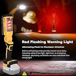 𝐓wo 𝐁rightness 𝐌ode & 𝐑ed 𝐒trobe 𝐒𝐎𝐒 𝐌ode 18W high-efficiency LED delivers bright, clear 6500K daylight illumination, providing excellent visibility for jobsite tasks, garage repairs, new home decoration and outdoor use. Two brightness levels, you can customize the lighting to suit the task, ensuring optimal visibility or extending battery life. The red strobe SOS flashing mode provides a useful warning on the road, with powerful warning capability that helps keep people, vehicles, and property safe. 𝐂ompatible with 𝐃𝐄𝐖𝐀𝐋𝐓 20V 𝐌𝐀𝐗 𝐁attery Designed to work with DE WALT 20V MAX lithium-ion batteries (Tool only. No battery, battery not included), such as DCB200 DCB201 DCB203 DCB204 DCB205 DCB206 DCB230 DCB240 DCB246 etc. offering cordless convenience and flexibility without the need for extension cords. If you already own De Walt batteries and chargers, you will avoid unnecessary expenses. 𝐀djustable 𝐇ead & 𝐖aterpoof Our rechargeable work light features a 180 degree adjustable light head, allows you to direct illumination where you need it, the metal hook design allows for flexible placement in various work conditions, delivering wide-angle coverage for hands-free lighting in tight or dark spaces. and this rechargeable work light can be protected against splashing water from all angles, IP66-Rated Protection, work confidently in any weather, rain, splashes, or dusty environments won’t stop your work. 𝐔𝐒𝐁 𝐂harging & 𝐏ower 𝐎utput This handheld flashlight features dual charging ports and reverse-charges mobile devices like smartphones and tablets using a USB/Type-C port (5V 1A). enables you to power or charge small devices such as smartphones during work or emergencies, adding extra practicality on the jobsite or outdoors. It can power two devices simultaneously, effectively acting as a power bank, giving you two powerful functions in one. 𝐏ortable, 𝐃urable & 𝐌ulti-𝐒cene 𝐔se Compact, lightweight, and durable design makes it easy to carry and store, ideal for construction sites, workshops, camping, power outages, and emergency situations. Over-molded lens cover provides increased durability and a non-marring surface for the jobsite.
