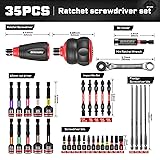 35 Pieces Screwdriver Set: 1pc rachet stubby screwdriver handle,1pc dual end rachet socket wrench;22pcs 1”/6” impact screwdriver bit(phillips/torx/square/slotted);10pcs nut driver(1/4,5/16,3/8,7/16,1/2,6mm,8mm,10mm,11mm,13mm),1pc impact bit holder.One kit contains all the essential tools you need for your DIY projects or professional work. Left/Right Ratchet Lock: Featuring a bottom-mounted ratcheting knob(left/right lock) to drive or remove screws quickly with minimal hand movement. Perfect for the portable hand tools set, it reduces fatigue and boosts efficiency in prolonged use. 2-in-1 Detachable Design:This detachable stubby screwdriver handle splits into both a mini ratchet wrench and a standard screwdriver. Use them separately as compact tools or connect them to form a longer handle for increased leverage, perfect for DIY projects and outdoor work. Durable PP Head & Soft TPR Grip: Equipped with a tough PP connection head for a secure, wobble-free fit with all bits and sockets, while the textured TPR handle ensures a comfortable, non-slip hold during extended use in DIY or outdoor projects. Portable and Space-Saving: Portable design and interchangeable heads,suit for screwdriver Bit, Nut driver, Socket Adapter and other 1/4” shank bits.