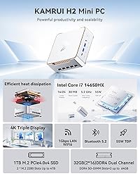 【HX-Class Performance】Power by Intel Core i7 14650HX (16 Cores/24 Threads, up to 5.2GHz, TDP 55W, 30MB Smart Cache) — HX Series: Desktop-Grade Speed and Power. Compared to Ryzen 7 H255/8745HS, delivers higher stability and sustained multi-core performance under heavy workloads. Versus i7-12600H and R7 6800H, it offers 10-25% better performance. mini pc delivers excellent HX-Desktop-Level HX Power in high-intensity multitasking scenarios, such as 3A gaming, 3D rendering, and video editing. 【32GB RAM & 1TB NVMe SSD - expandable up to 4TB】 This Intel W-11 professional mini PC comes with 32GB (16GB*2)dual-channel memory, delivering 50-70% faster responsiveness than 16GB RAM. Equipped with 1TB NVMe PCIe4.0×4 SSD, booting and loading large software or games is 40% faster than than PCIe Gen3. Dual M.2 slots allow storage expansion up to 4TB, offers the perfect balance of speed, capacity, and flexibility, meeting the high-load demands of the next few years. 【Triple 4K Display Support for Ultimate Productivity 】 KAMRUI H2 14650HX mini PC with Integrated In-tel UHD Graphics supports up to three 4K displays simultaneously (4K@60Hz), up to 1.5GHz dynamic frequency, simultaneously for stunning image quality and an immersive visual experience. Perfect for multitasking, data analysis, or multi-window design workflows, boosting productivity up to 2-3× over a single-screen setup. 【HX-Class Heat Dissipation】Built for Serious Performance, Equipped with upgraded silent centrifugal fans, dual copper heat pipes, dual fin-stack cooling modules, and an optimized dual-airflow design, the processor can maintain ≥95% of multi-core performance even under long-duration heavy workloads and full multi-core load. The HX platform is specifically designed for high-intensity rendering, light gaming, and multitasking, delivering desktop-class stability and powerful performance. 【Superior Network Connectivity】Experience lightning-fast, stable connectivity with WiFi 6 (3x faster than Wi-Fi 5) —perfect for 4K streaming, smooth video conferencing, and rapid file transfers without interruptions. Bluetooth 5.2 offers faster, more reliable connections to wireless peripherals like headphones, keyboards, and mice with ultra-low latency. 【Compact Size, Infinite Possibilities】The KAMRUI H2 mini computer measures just 5.04 x 5.04 x 1.63 inches, a fraction of the size of a traditional desktop, yet delivers powerful performance for demanding workloads. With the included VESA mount, you can easily attach small pc behind a monitor or place it in your TV cabinet, turning your display into a sleek all-in-one PC while saving valuable desk space. 【Versatile Connectivity】This mini gaming computers comes with 1x Type-C(10Gbps data transfer), 1x RJ45 Ethernet , 2x USB3.2 Gen2 (10Gbps), 4x USB3.2 Gen1 Type-A (5Gbps), PD output), 1x HDMI 2.0, 1x DP 1.4, and 1x 3.5mm audio jack, Offers versatile connectivity to connect multiple devices effortlessly — reduce the need for frequent plugging and unplugging.