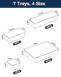 Multi-purpose organization magic: Effortlessly declutter ANY drawer! Perfect for organizing makeup, cosmetics, skincare, jewelry, office supplies, utensils, spices, socks, underwear, crafts, small tools, and more in your bedroom, bathroom, kitchen, office, or craft room. Crystal clear visibility: Made from durable, transparent plastic so you can instantly see and access everything inside. No more digging through messy drawers to find what you need Customizable fit stackable design : This 7 piece set features multiple rectangle and square bins in various sizes. (1pcs 9*6.1*2.16 inches, 2pcs 8.97*2.95*2.2 inches, 2pcs 5.94*3.03*2.2inches, 2pcs 3.03*3.03*2.16 inches)Mix, match, and arrange them to perfectly fit your unique drawer dimensions. Their stackable design maximizes vertical space when needed. lightweight & durable: Crafted from sturdy yet lightweight BPA-free plastic. Easy to lift, move, and clean (wipe clean with a damp cloth). Built to withstand daily use without cracking or yellowing easily. Smart sizes for everything: Thoughtfully designed dimensions hold a wide range of items securely. Great for palettes, lipsticks, brushes (Makeup), cutlery, spice jars (Kitchen), socks, ties, small accessories (Bedroom), pens, paperclips (Office), and countless other small essentials.