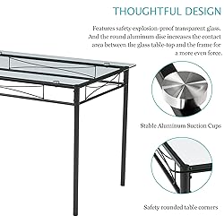 - The solid metal frame enhances strength and stability without wobbling.The glass tabletop design adds a touch of elegance and sophistication to your home.Soft cushions and durable leather materials provide a comfortable dining experience.Suitable for a variety of environments, including dining areas, lounge spaces, small spaces, and more. Specification:Materials: Metal, Tempered Glass, PUColor: BlackTable Dimension: 43.3(L)*27.5(W)*30(H)Chair Dimension: 16.9(L) * 15.7 (W)*33.8 (H)Max. Load: Table bears 200 lbs, chair bears 350 lbsSeating Capacity: 4 Package Includes:1 x Dining Table4 x Chairs1 x Instructions1 x Accessory Bags Tips:Please read the instructions carefully before assembly, ensuring parts and screws are firmly attached before use.