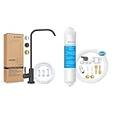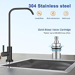 【Suitable for various thicknesses of countertop】:The long thread stem drinking water faucet suitable for various thicknesses of countertop,especially for the extra thick countertop,up to 2.42in/6.15cm;Alsothe long thread stem makes it easy to install fitting and hose under narrow countertop. 【Designed for drinking water】:After hundreds of selections and tests, the special stainless steel material used in this filtered water faucet is proven to be safe and lead-free ,with 7-shape 360° swivel spout and 90° single handle water flow control, meets any angle you need. 【Suitable for various filter outlets】: With 2 size of push connect fittings(1/4''-1/4' and 1/4'' -3/8''), suitable for reverse osmosis system or other water filtration system with different water outlet sizes.Also comes with 1/4'' O.D. water hose, which can be used to replace old hose or to extend existing hose. 【Easy Installation】The RO faucet end water inlet,connecting fittings and water hose are all push connect type; The nut used to lock the faucet is washer wing design;So your installation will be very easy and can be done in a few minutes without using any tools. 【Durable and refined】:The core of Reverse Osmosis faucet is valve,our high-grade ceramic valve core has been tested 500,000 times, no leakage,ensure long-lasting service life;Matte black coating on faucet surfaces is beautiful, anti-corrosion, anti-rust and easy to clean.
