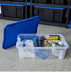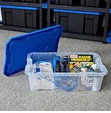 GENEROUS CAPACITY: This 17-gallon (68-quart) heavy-duty storage tote provides ample space for organizing tools, seasonal items, garage supplies, and household essentials SECURE LATCHING LID: Features a bright blue snap-on lid with integrated latches that keep contents protected from dust and moisture while ensuring the lid stays firmly in place STACKABLE DESIGN: Reinforced construction allows multiple totes to be safely stacked on top of each other, maximizing vertical storage space in garages, basements, and closets DURABLE CONSTRUCTION: Made from thick, impact-resistant black plastic that withstands heavy use and can hold substantial weight without cracking or warping DIMENSIONS: Measures 31.6 inches long by 20 inches wide by 9.2 inches high, providing a low-profile storage solution that fits easily under beds, on shelves, or in vehicle cargo areas