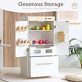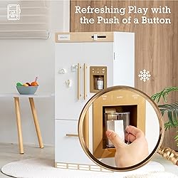 Immersive Play & Realistic Features: Ignite your child’s imagination with an interactive refrigerator that feels just like the real deal. The built-in ice maker dispenses wooden ice cubes and the temperature control knob adds a fun, hands-on twist to every play session Spacious & Organized Design: Designed with double doors and a lower freezer drawer, this play appliance offers plenty of room to neatly store play food and drinks. It not only enhances the play kitchen experience but also helps nurture early organizational skills Personalize the Fun: Bright, colorful fridge magnets come included—perfect for letting kids decorate their fridge, sparking creativity and making every playtime uniquely their own Kid-Friendly & Safe: At a perfect 33 inches tall with smooth, sturdy construction, this play fridge is ideal for toddlers and preschoolers. Every edge is crafted for safety, giving parents peace of mind while little ones explore Complete Accessory Set: Beyond the ice maker, the set comes with a range of engaging accessories—wooden ice cubes, a cup, eggs, and more—It providing pretend fun and encourages them to organize and arrange their toys just like a real refrigerator