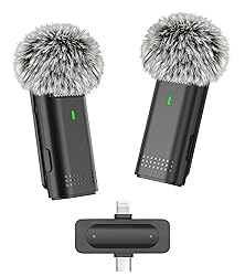 Dual Mics: 2 in 1 receivers, these wireless lavalier microphones compatible with iPhone Lightning and USB-C devices, ideal for creators, interviews Plug and Play Compatibility: Connects directly to phones without apps or complex setup, just turn on the microphone for immediate use Professional Audio Quality: 24bit 48Khz hifi audio process with advanced noise cancellation delivers clear voice capture for vlogs, podcasts, and streams Compact Lapel Design: Discreet clip-on lav mic ensures hands-free recording for interviews and presentations Long Battery Life: Provides up to 6 hours of continuous recording, supporting extended use on the go With Windscreen: Help your lavalier microphone performs better than foam caps, enjoy incredible audio in windy outdoors