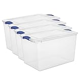 - This 4‑pack of 66 Quart clear plastic storage bins offers practical, multi-purpose organization for your home, garage, closet, pantry, bedroom, and office. Featuring a clear base and lid, these bins let you easily identify contents from any angle without opening the lid, streamlining daily access and organization. Each bin is fitted with sturdy blue latches that secure the lid tightly to the base, keeping contents enclosed and protected from dust. The recessed lid design enables stable, neat stacking of multiple units to maximize vertical storage space, keeping your space tidy and clutter‑free. Externally measuring 24" L x 16" W x 13 7/8" H, the spacious interior accommodates clothing, blankets, tools, holiday decor, office supplies, and more. Made from heavy‑duty plastic, these bins are built for long‑lasting daily home use. Lids are interchangeable with 32‑quart bins of the same style for flexible stacking and efficient space‑saving storage