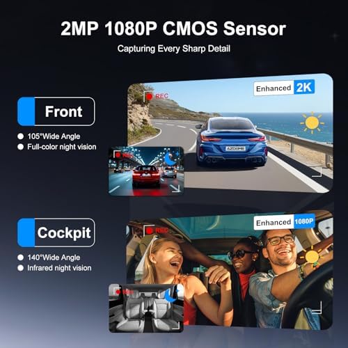 - 【Dual 1080P HD Recording & Two-Way Audio】 Capture crisp footage inside and out with dual 2MP 1080P CMOS sensors and wide-angle lenses (105°front,140° interior). This dash cam front and interior also supports two-way talk, so you can communicate in real time through the app—perfect for rideshare, family safety, or deterring intruders live.