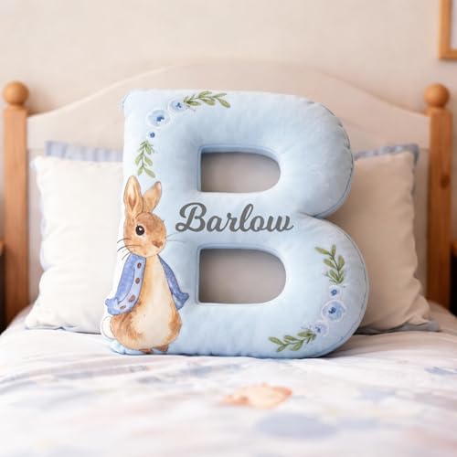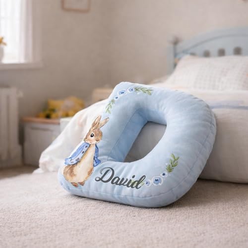 - Personalized Initial Design – Features a soft letter-shaped pillow customized with your child’s name, paired with a sweet bunny illustration for a charming nursery or bedroom accent.