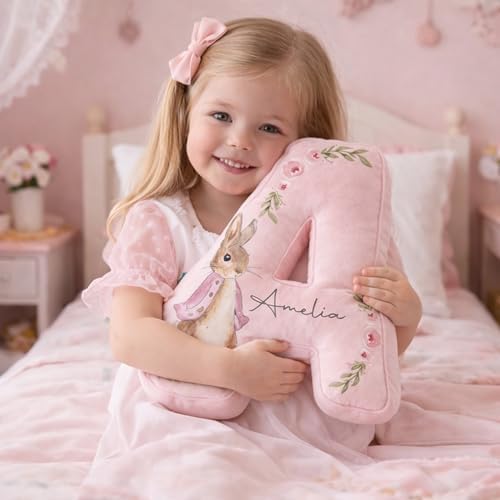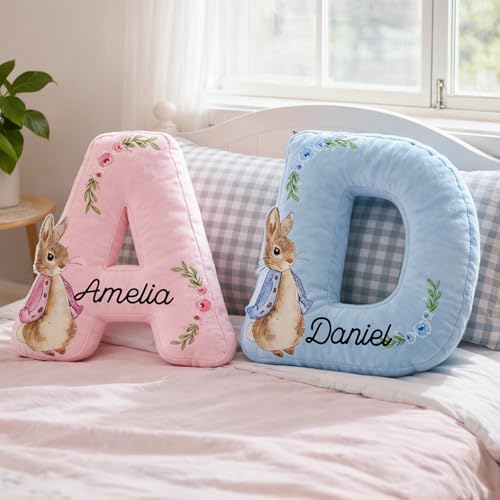 Custom Initial Pillow for Kids with Name, Personalized Bunny Letter Cushion for Girls, Nursery Decor Throw Pillow, Easter Gift for Child, Birthday Present for Daughter, Room Accent