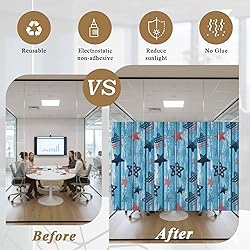 Independence Day Privacy Window Film, Five-Pointed Star U. S. Flag Blue Wood Grain Stained Glass Film Non-Adhesive Window Clings, UV Blocking Static Sticker Covering Reusable for Home 19.6x39.3in
